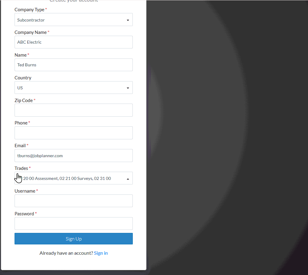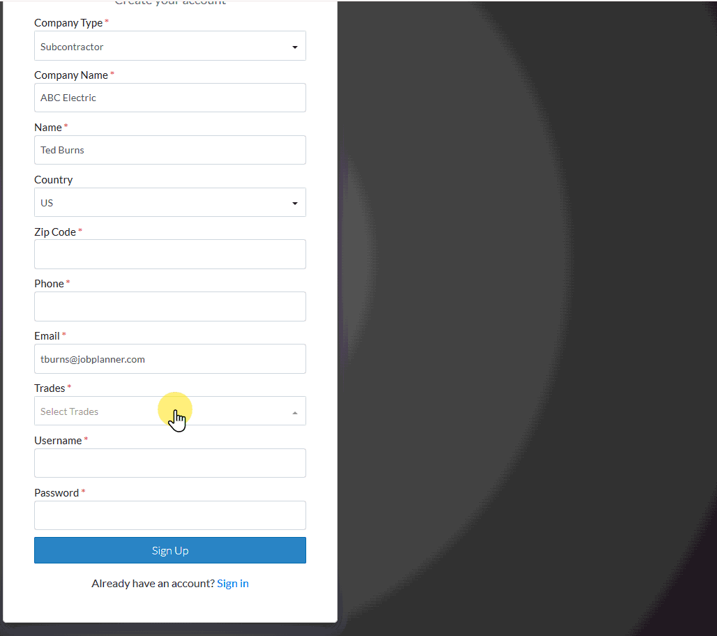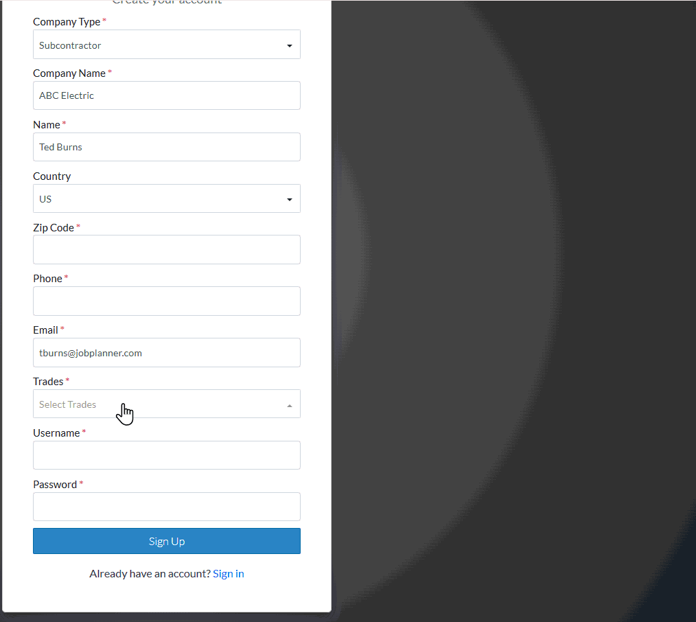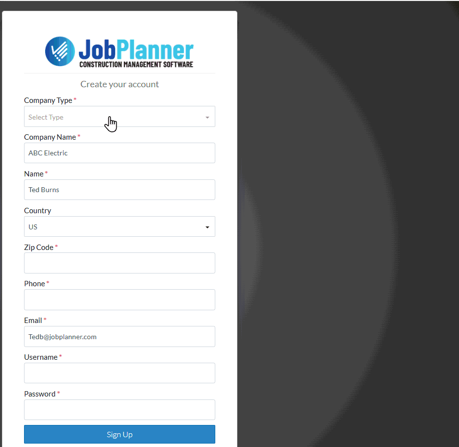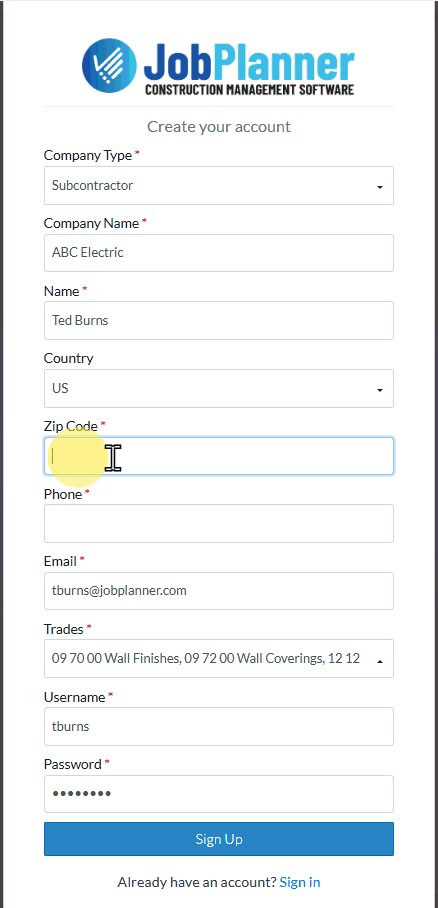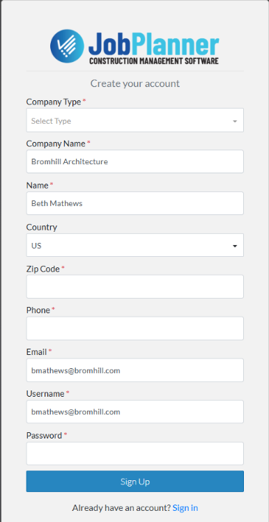 Enter the User name, you want to use to sign into Jobplanner. This can be the same or different than your email.