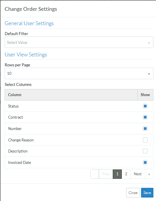 The default number of rows per page to display on the list of all Contracts Change Orders can be set.
