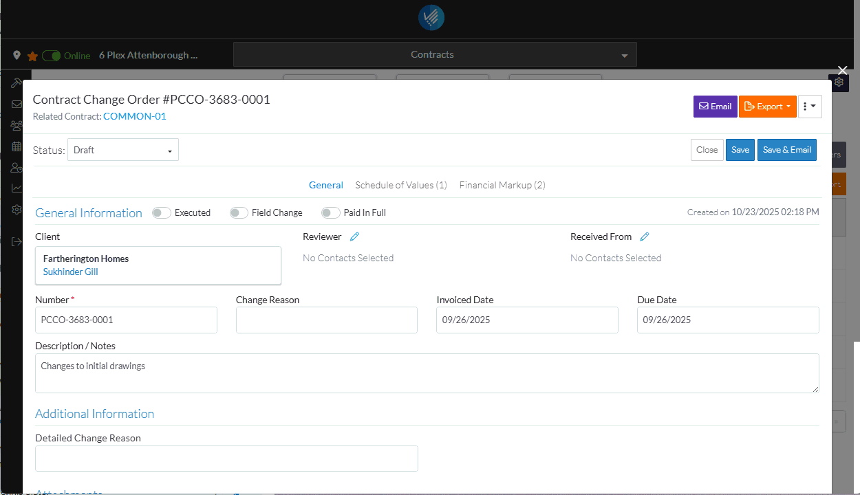 The Contract Change Order can be deleted from any of the Components; General, Schedule of Values or Financial Markups.