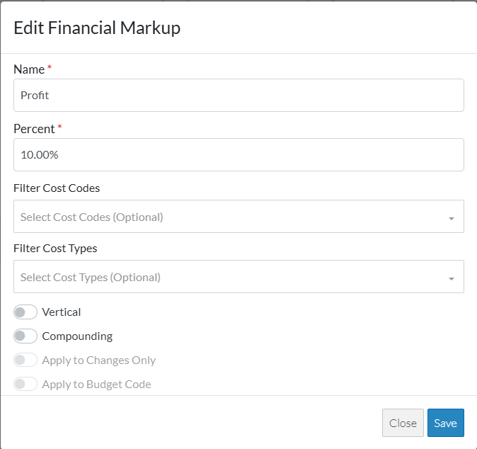 - To turn on or off applying this Financial Markup to apply only to Change Orders and Change Requests or not, toggle the Apply to Changes Only option on. See Financial Markup - Apply to Changes Only.