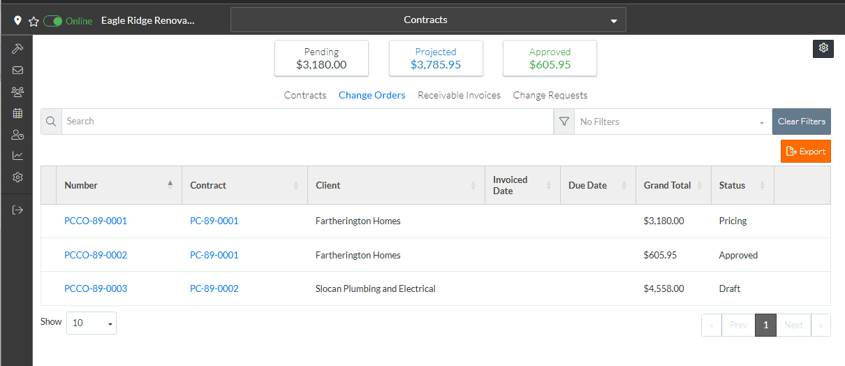 To search for contracts and/or filter the list of Contracts, see Contracts - List of All Change Orders - Search and Filter.