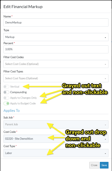 When adding Financial Markups for a Contract and the Contract is in a Status that can't be changed, the Financial Markup can still be added for the Contract, however, the Apply to Changes Only option is set on by default and can't be changed (because the Financial Markup can only be applied to Change Orders). This applies to the add or edit.