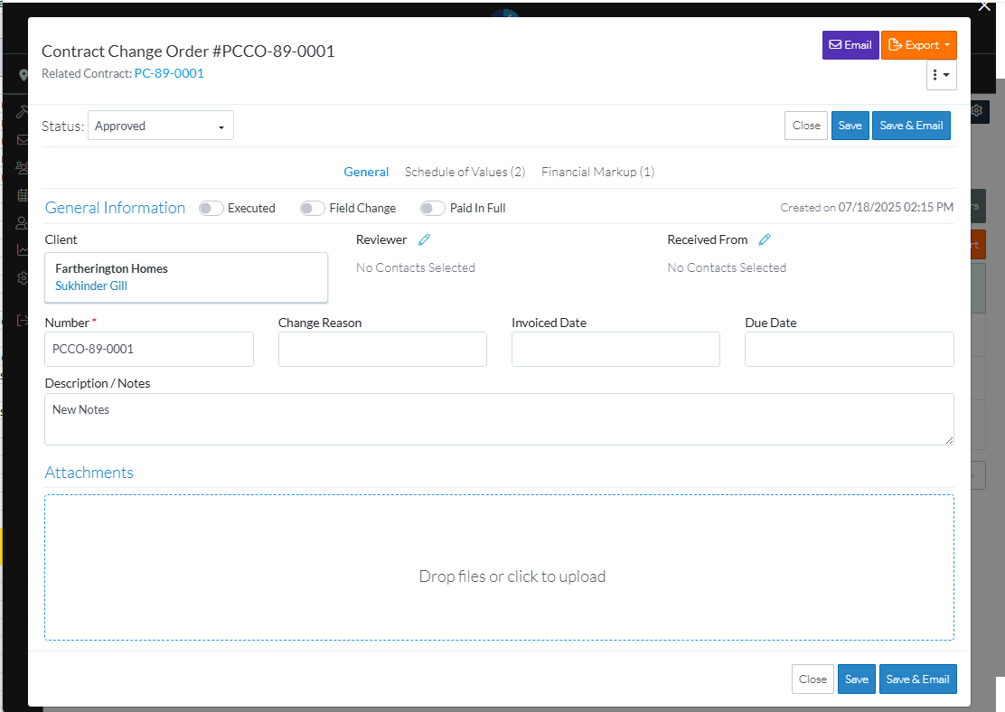 For a New Change Order or editing an existing Change Order, all the details on the Contract General component can be added or changed except for the Client which is inherited from the Contract.