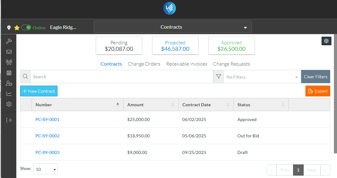 Clicking on those menu options from here shows all Contracts, all Change Orders, all Receivable Invoices and all Change Requests for the Project.