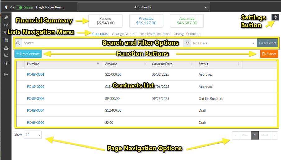 - Function Buttons to add New Contracts or Export the Contracts list.
