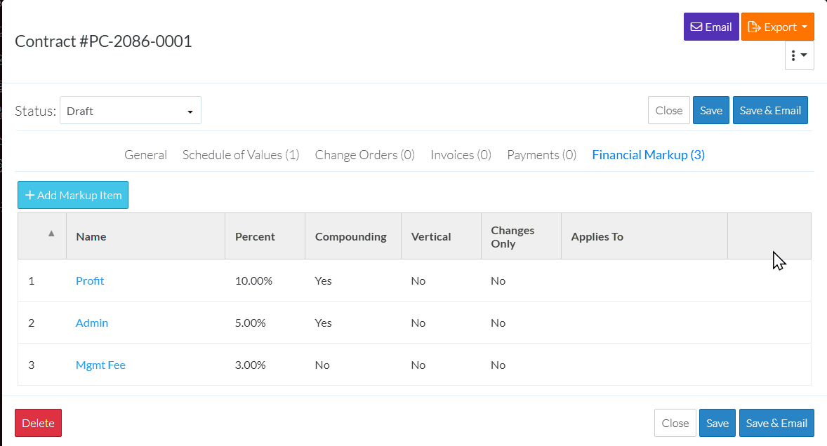 If the Status indicates they can be deleted, Financial Markups can be deleted and the Financial Markup is automatically removed from the Schedule of Values and recalculated.