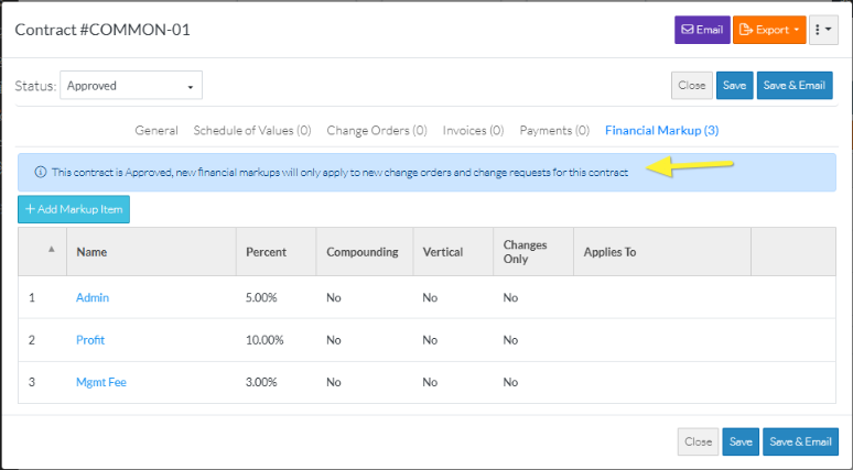 If the Contract is in a status that doesn't enable editing, new Financial Markups can't be added for the Contract, however, from this form Financial Markups can still be added that apply to Change Orders for the Contract or Change Requests for the Contract. Note* Entering them at the Contract level, gives the option of copying these Financial Markups to any/all Change Order or Change Requests created to easily apply the same Financial Markups. Financial Markups can also be entered specifically for a Change Order or Change Request but apply only to that specific item.