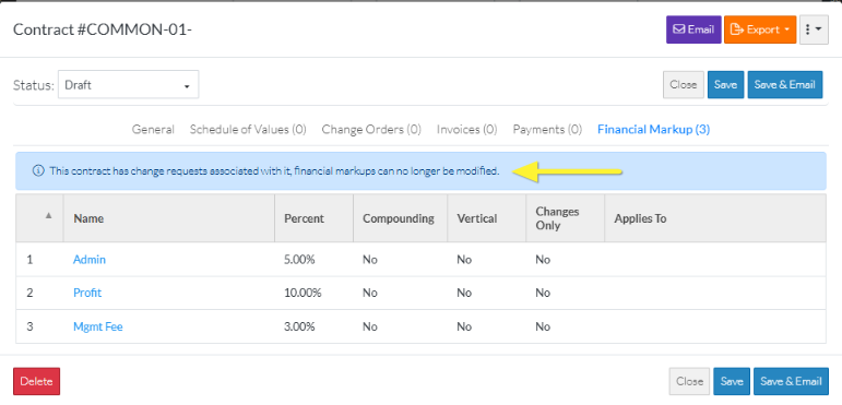 If a Contract has a Change Request created for it, the Financial Markups can not be changed. A message appears indicating that.