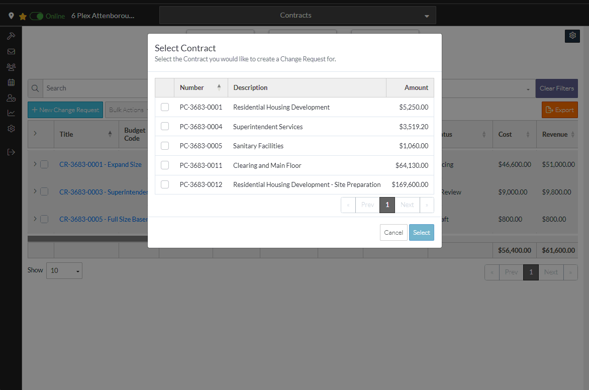 The Select Contract form displays which is a list of all Approved Contracts for the Project.