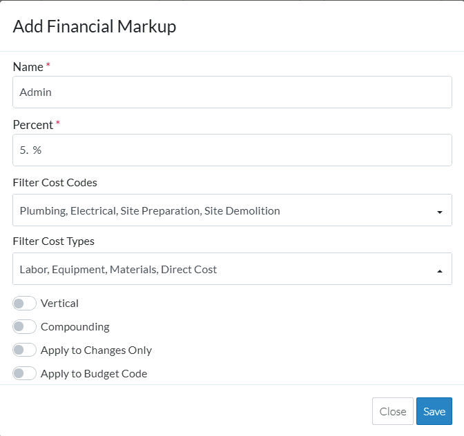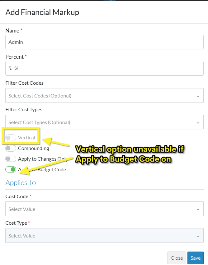Note* This option isn't available if Apply to Budget Code is turned on. This optional also effects how the financial markup is calculated and displays and if this is on, it renders the Vertical option not applicable. See see Financial Markup - Calculation and Display for more information.
