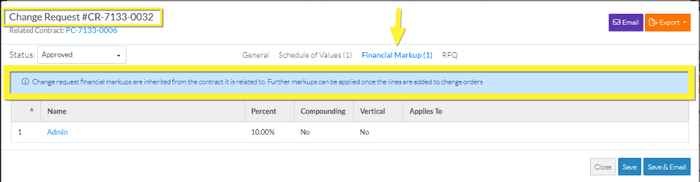 Access and view the Change Request Financial Markups, see Contract Change Order - Financial Markups - Accessing and Viewing.