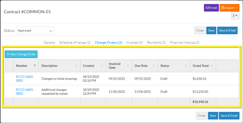 - A list of the Change Orders specific to that Contract (or it may be blank if no Change Orders have been added)
