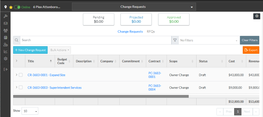 It is also where new Change Requests can be added, and/or Change Requests can be viewed (From the View/Edit form, Change Requests can then be edited, Schedule of Values can be maintained, Line Items on the Schedule of Values can be assigned to Contract Change Orders, Commitments or Commitment Change Orders, RFQs can be created, Financial Markups can be maintained, the Change Request can be deleted or it can be exported to a PDF or emailed).