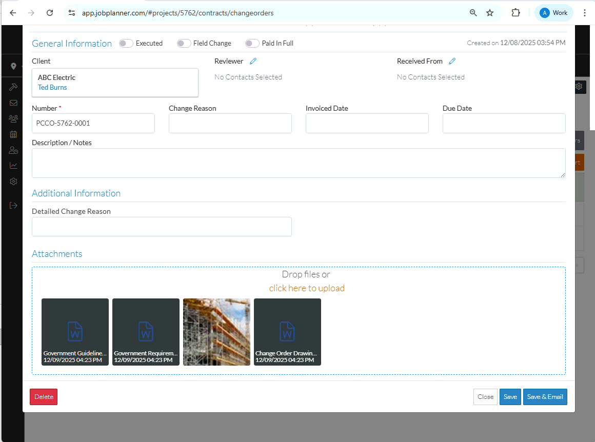 On the Contracts Change Order General form, there are files can be uploaded for the Change Order.