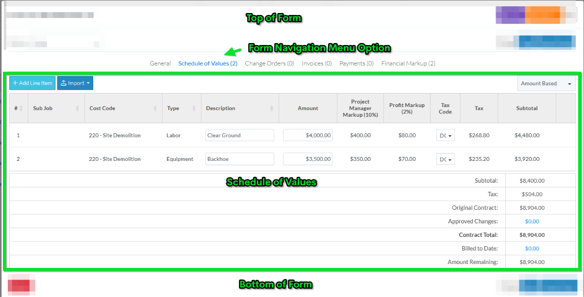 If Financial Markups are applicable to the Schedule of Values, see Financial Markups - Overview for more information.