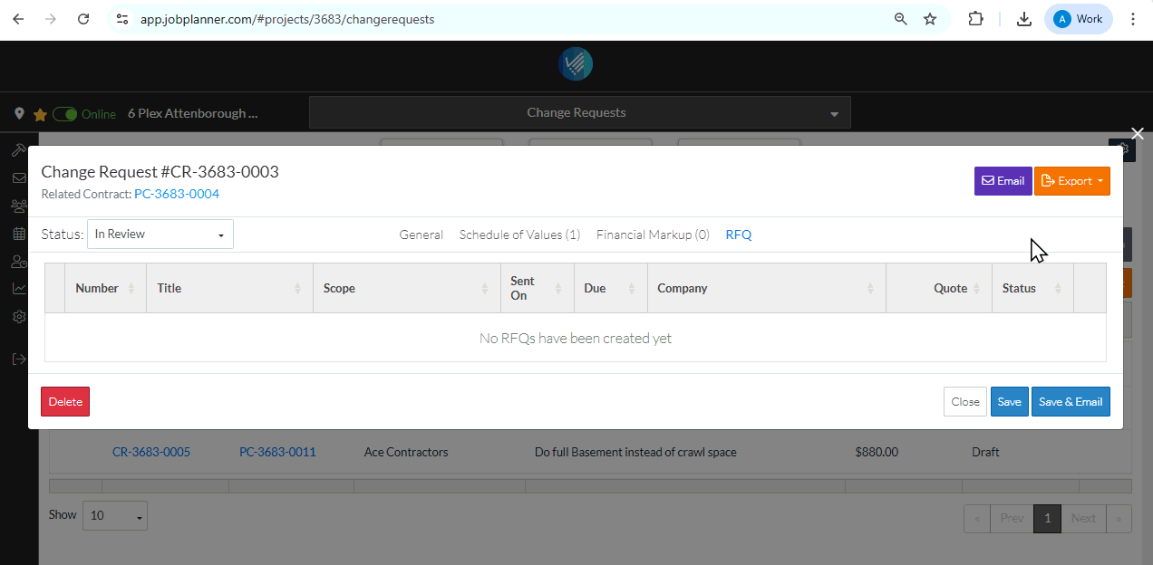 The Change Request can be exported from any of the Components; General, Schedule of Values, Financial Markups or RFQs.