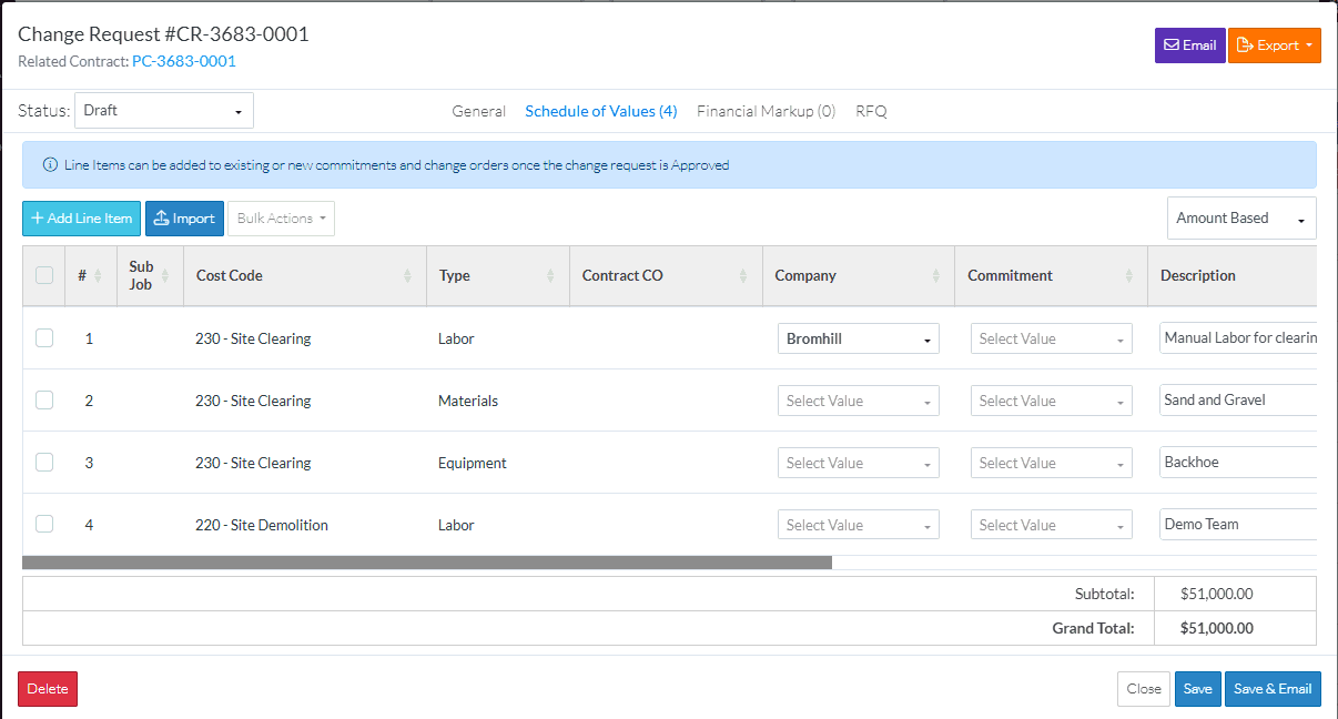 Create or manage Change Request Schedule of Values, see Change Request - Schedule of Values - Overview.