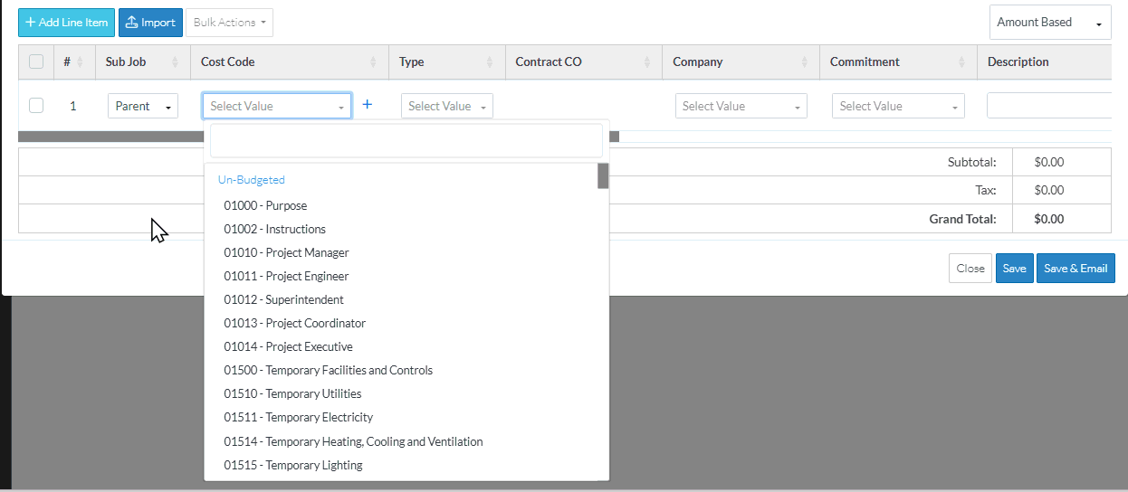 During the initial add of the line item (and before the form has been saved), Cost Codes are a drop down and they can be clicked in to select the Cost Code (as described above).