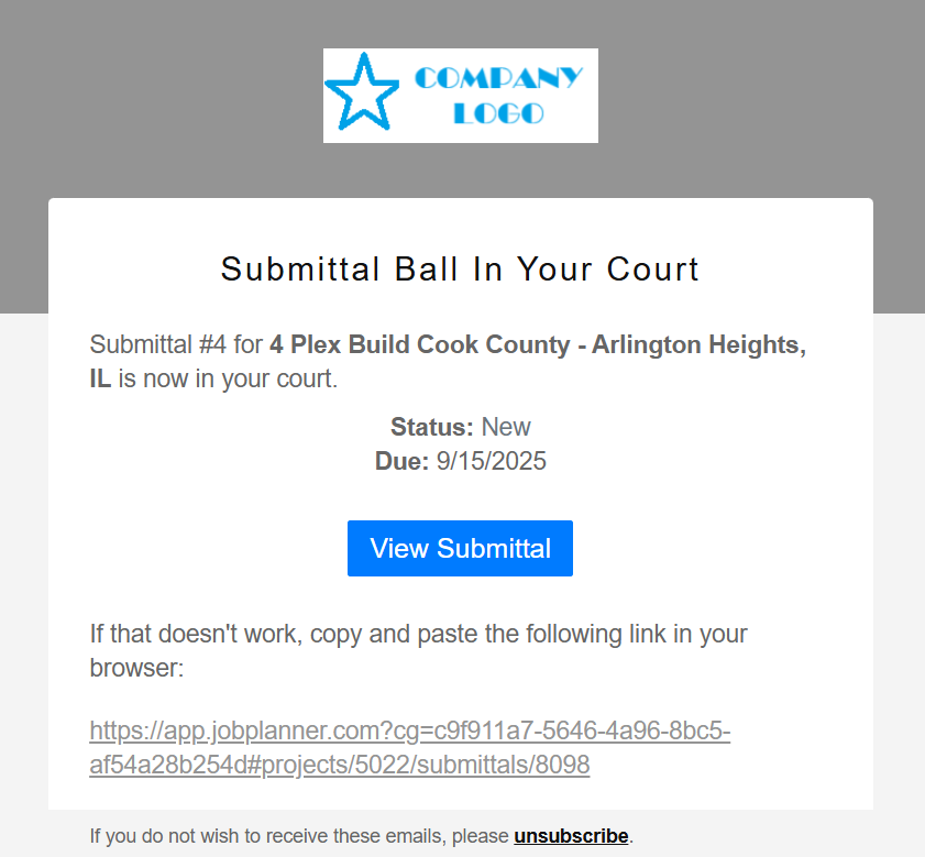 If a Company Logo was uploaded that appears at the top of the email (otherwise the JobPlanner logo displays).