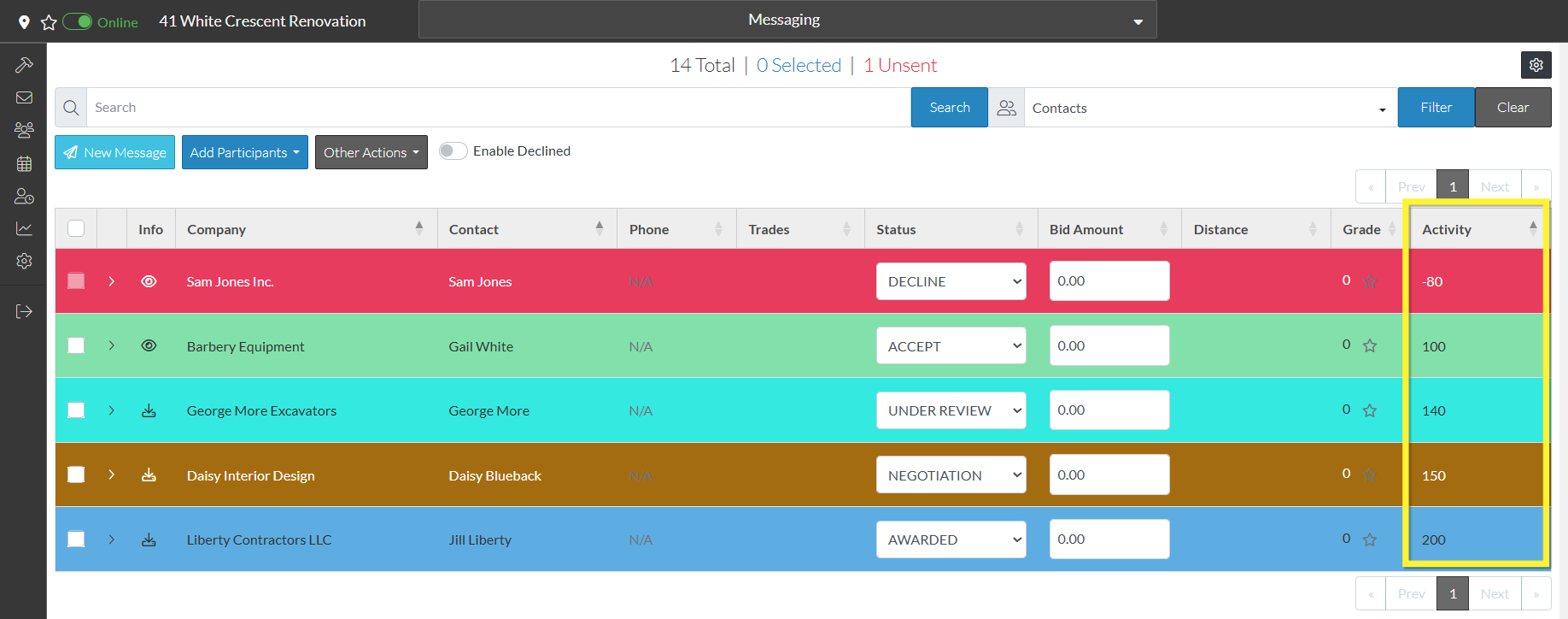 On the Bidding Messages List, if a Contact Row is displayed, (Bid Messages List – View Options) there is an Activity column that can be displayed (the column can be removed from the view via the Settings).