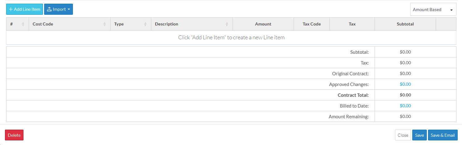 - Amount Based - Entering a single dollar amount for all the line items on the Schedule of Values