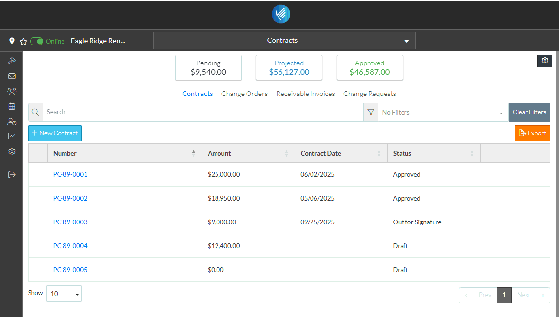 - From the Contracts List, click Change Orders in the List Navigation Menu. (See Contracts List – Layout and Navigation for more information).