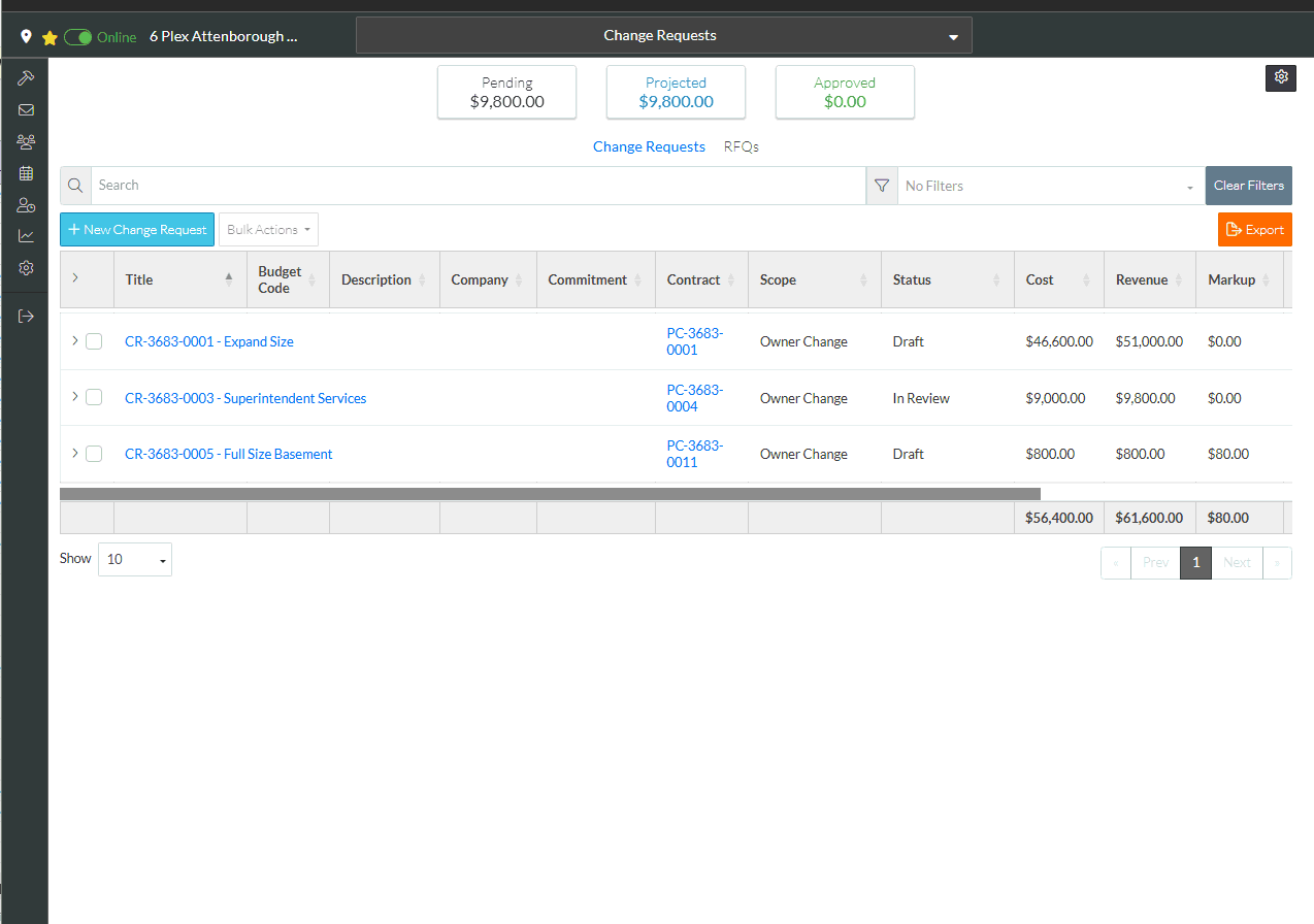 button at the bottom right of the form, saves all the information on the Change Request, Schedule of Values and Financial Markups first, then sends the email (so any changes made during this session will be saved and included on the PDF that is sent). After the information is emailed, the Change Requests List is displayed.