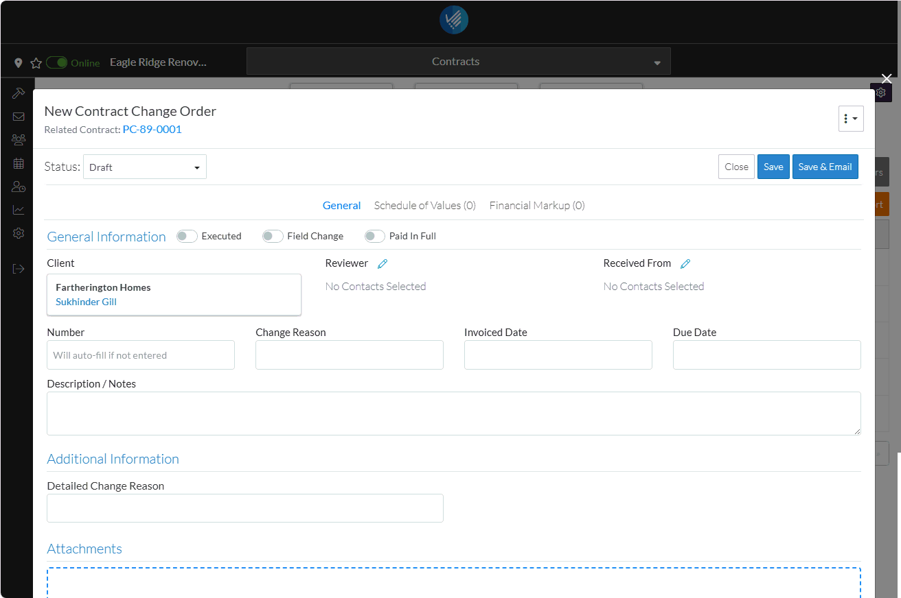 Enter or change other information as required, go to Next Steps below. OR Click the Save button (at either the top or bottom of the form) to save the Contract Change Order including the Status set and any other information on the General, Schedule of Values and Financial Markup components. The Contract Specific Change Orders List - Overview displays (see Contract Specific Change Orders List - Overview). OR Click the Save & Email button (at either the top or bottom of the form) to save all the information for the Contract Change Order as outlined above and send an email with a link to the Contract Change Order in JobPlanner (and optionally include the Change Order as a PDF attachment in the email). The Email Contract Change Order form displays (see Email Contract Change Order). OR Click the Close button (at either the top or bottom of the form) to close the form without saving the Change Request. If no information was changed or entered, the Change Request List OR the Contract - List of all Change Requests displays depending on which form the Add was invoked from (see Change Requests List - Overview or Contracts - List of all Change Requests - Overview). If information was changed, then an additional prompt displays to confirm that changes aren't to be saved.Click the Cancel button to cancel the Close action and return to the New Change Request form. see Next Steps below. OR Click the Don't Save button to cancel adding of the New Change Request. The Change Request List OR the Contract - List of all Change Requests displays depending on which form the Add was invoked from (see Change Requests List - Overview or Contracts - List of all Change Requests - Overview). OR Click the Save button to save the Change Request including the Status set and any other information on the General, Schedule of Values and Financial Markup components. The Change Request List OR the Contract - List of all Change Requests displays depending on which form the Add was invoked from (see Change Requests List - Overview or Contracts - List of all Change Requests - Overview).