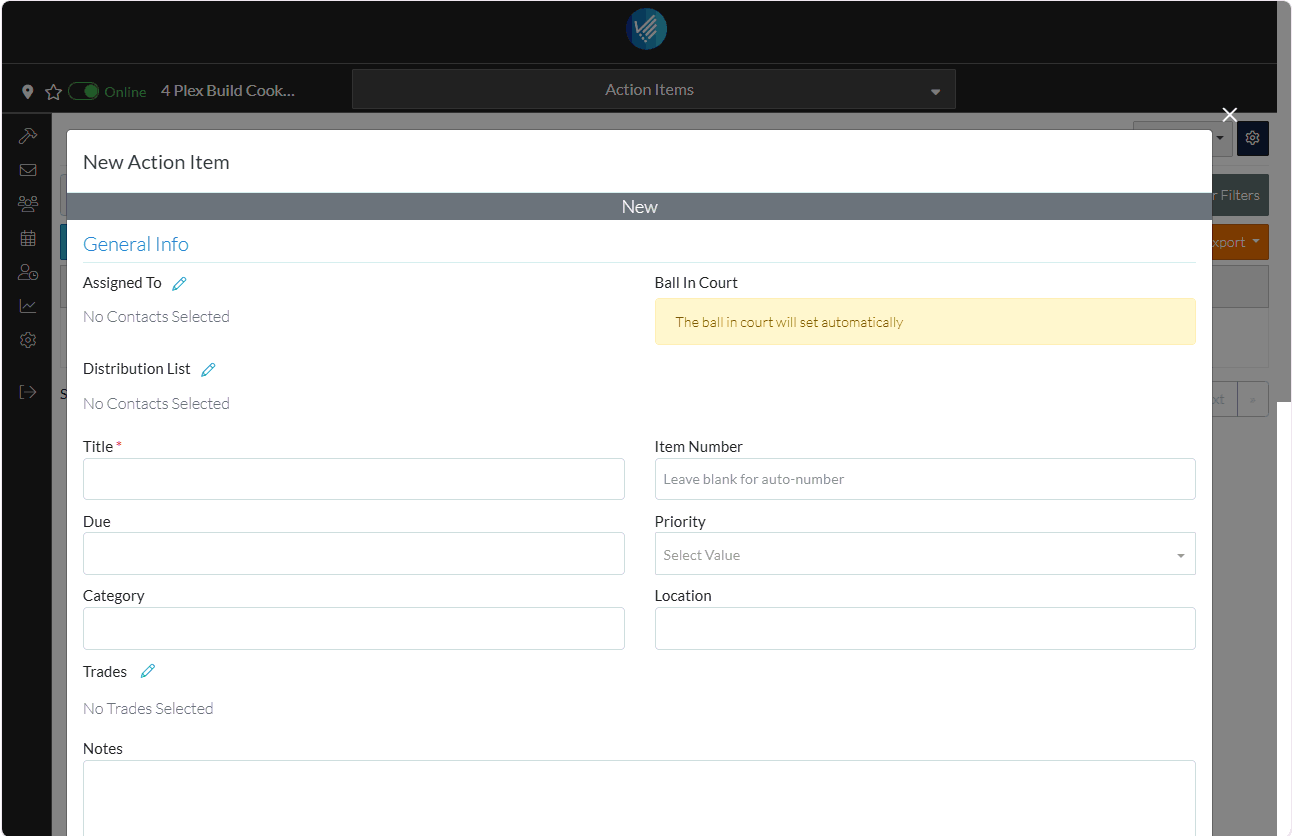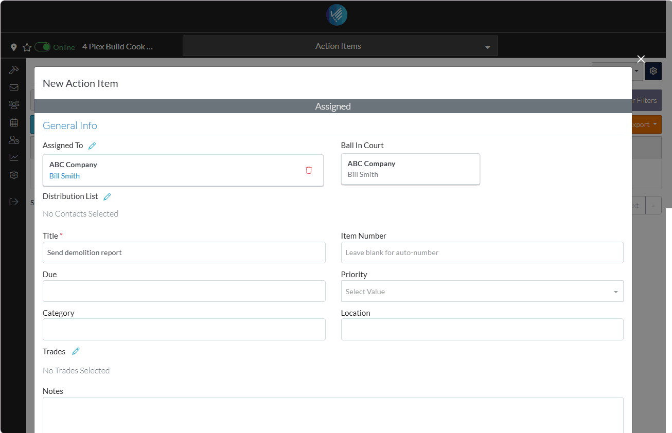There is other information that can be entered for the Action Item, such as entering a due date, priority and setting a category, entering a location specific to the Action Item, assigning a Trade, entering Notes, adding Attachments including before and after Attachments and recording comments.