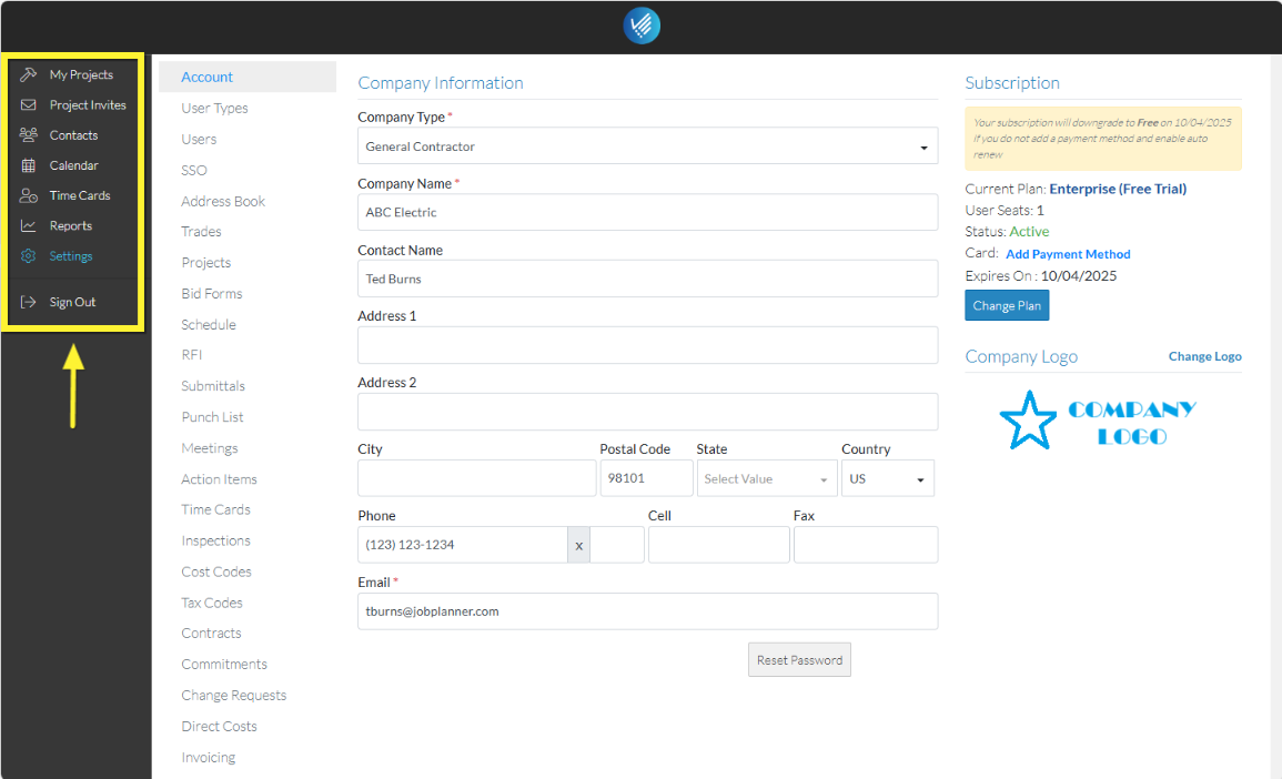 The Global Menu options may differ depending on User Permissions and Version of the plan.