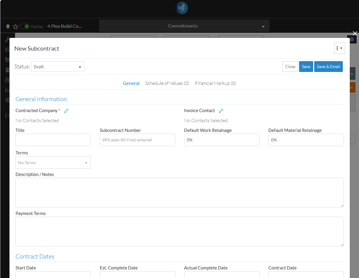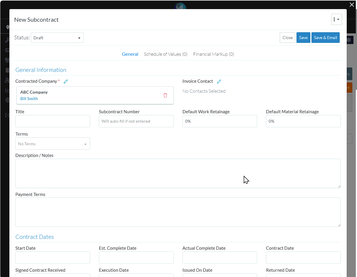 There is a lot of additional information that can be entered and managed for Subcontracts such as the Invoice Contact, Default Retainage, Terms, Notes, Payment Terms, Contract Dates, Inclusions and Exclusions, Attachments, Certificate of Insurance, W9, Signed Lien Waivers, Signed Documents, Affidavits and Executed Documents.