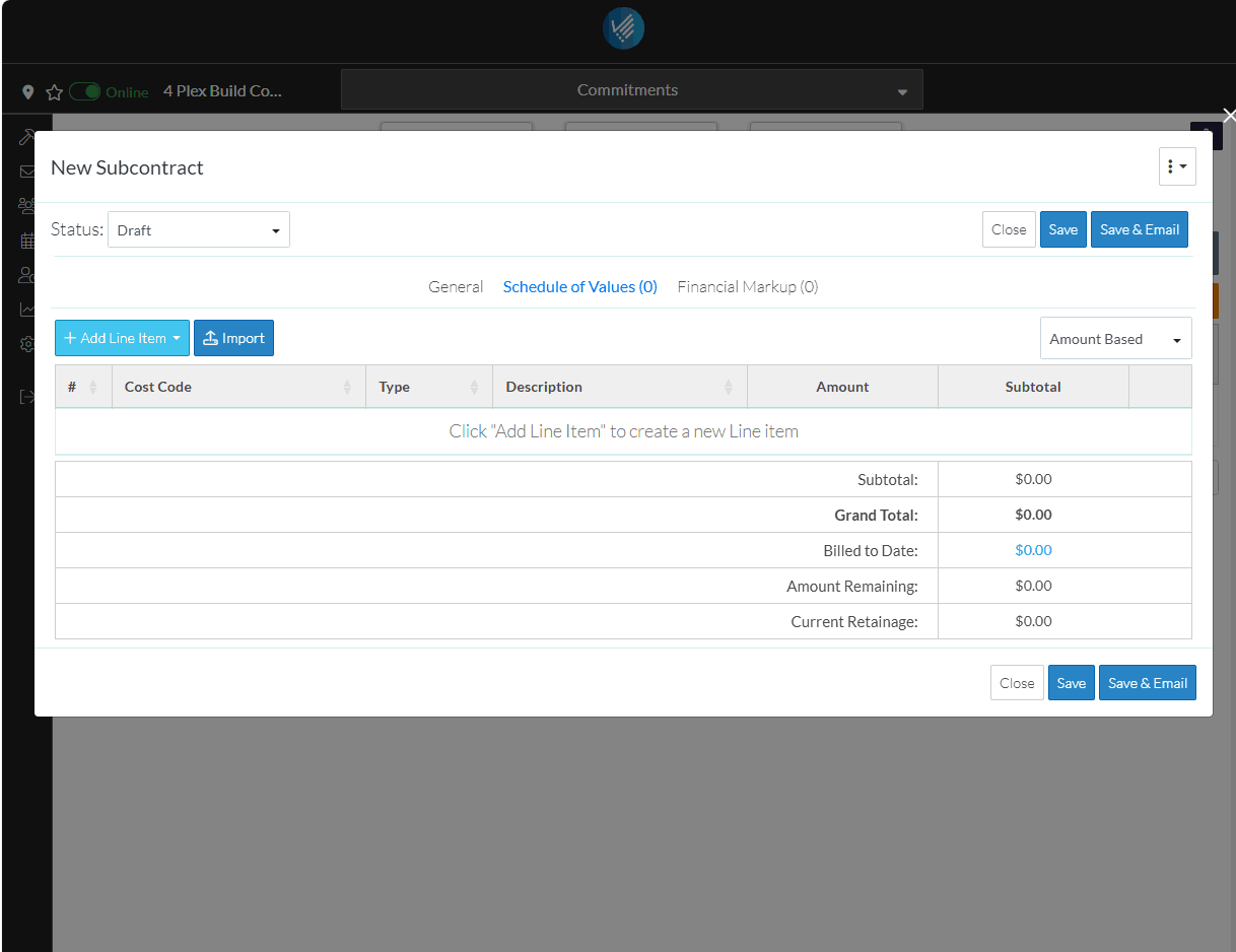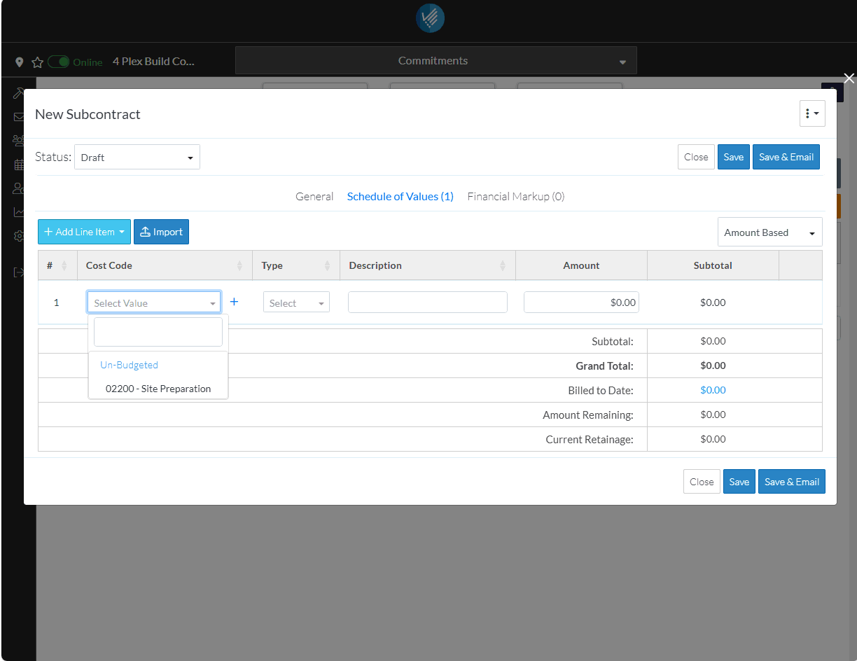 Once it is changed from a Draft status, such as to Out for Bid or Approved, the Financial Summary at the top of the form is automatically calculated based on all Subcontracts and Purchase Orders entered to give a quick overview. Also the Subcontract automatically appears on the Budget.