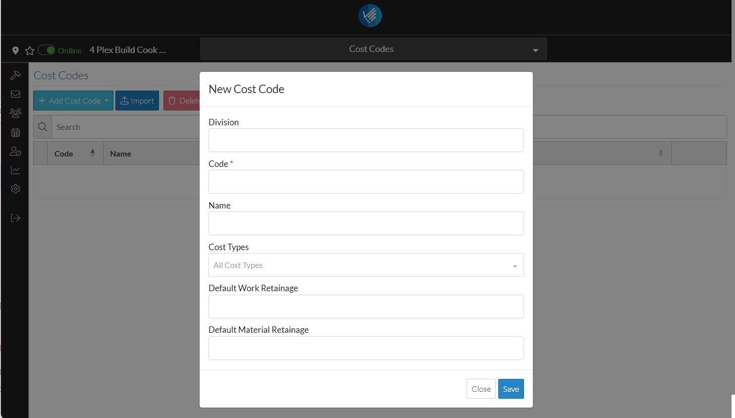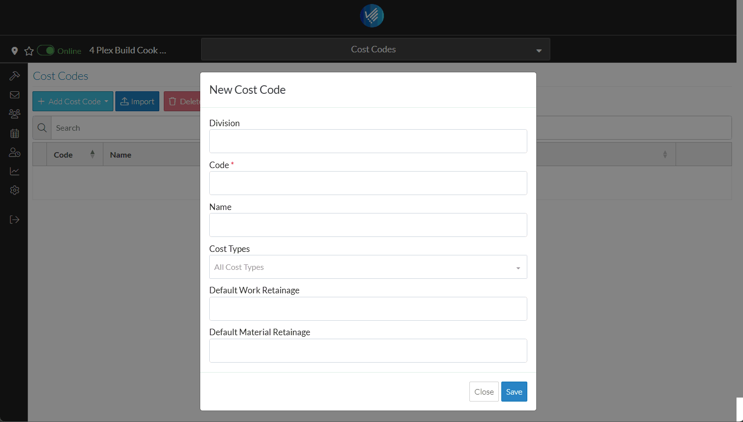 There are other options for Cost Codes such as organizing them into Divisions, setting Cost Types that can be used with the Cost Code and setting default retainage. To keep it simple for this example, just enter a Code and Description.
