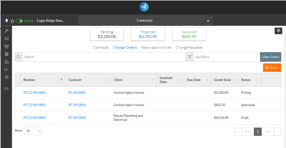 For a Project, all the Change Orders for all the Contracts can be viewed in a list.