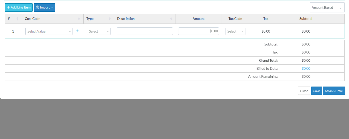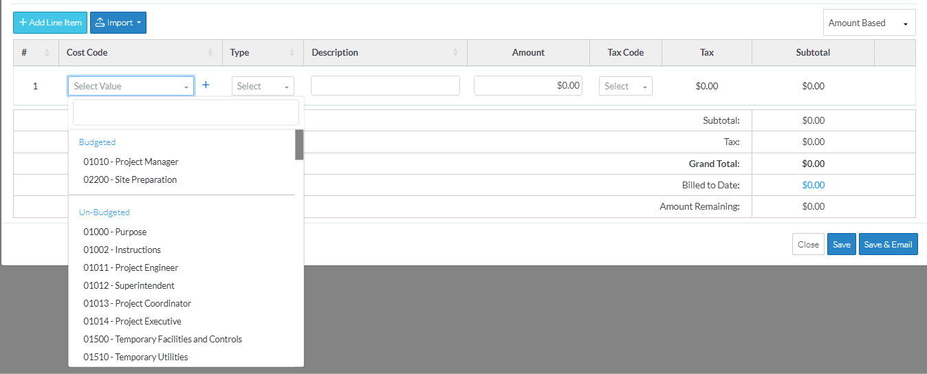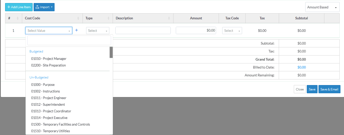 Cost Codes must be setup and Cost Codes assigned to the Project before the Line Items can be created. See Cost Codes - Overview for more information.