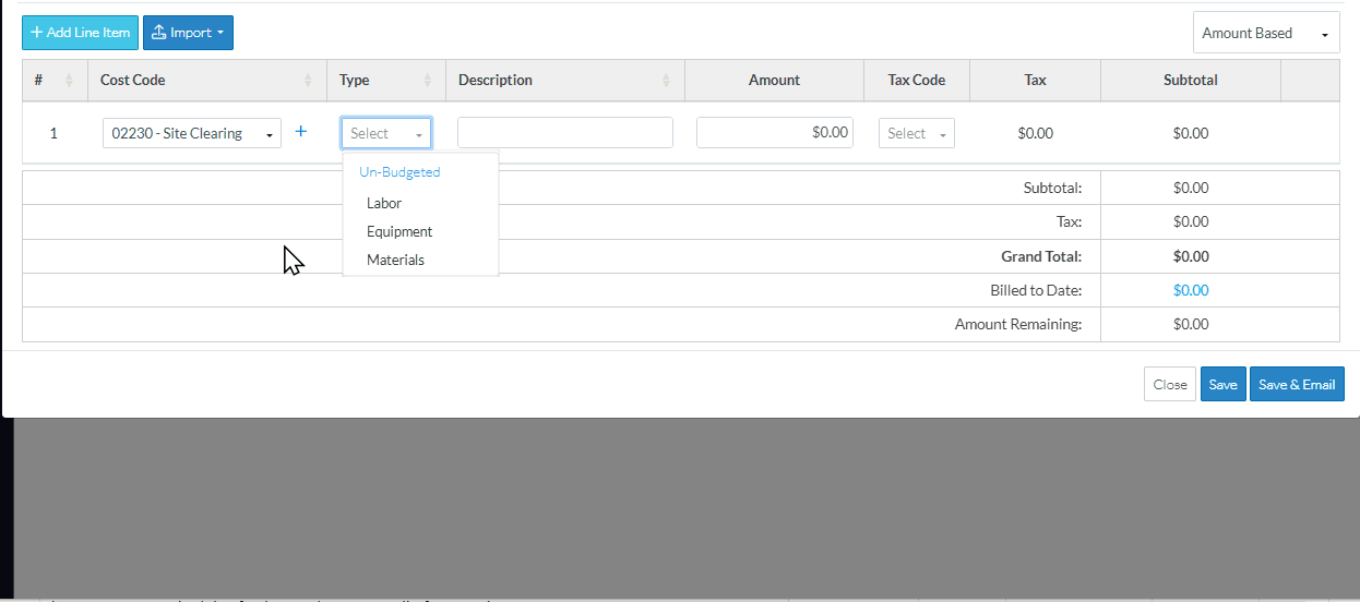 Cost Codes are linked to the Budget. Either Budgeted or Un-Budgeted Cost Codes can be selected. If the Cost Code is Un-Budgeted and the information is saved, a new line item will be automatically be created on the Budget with that Cost Code (and the Cost Type) as an Un-Budgeted Line Item. It can then be edited and set to Budgeted once it is reviewed and approved.