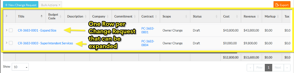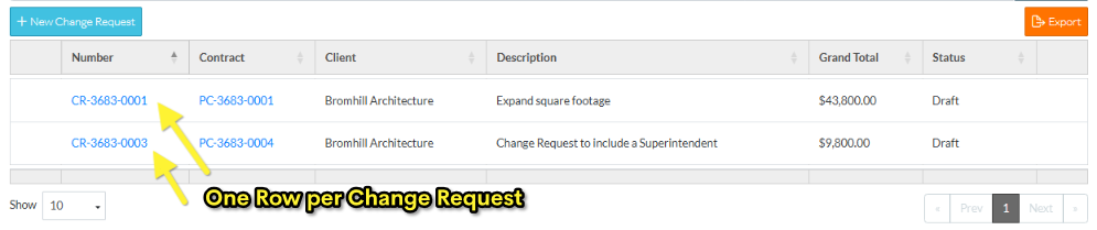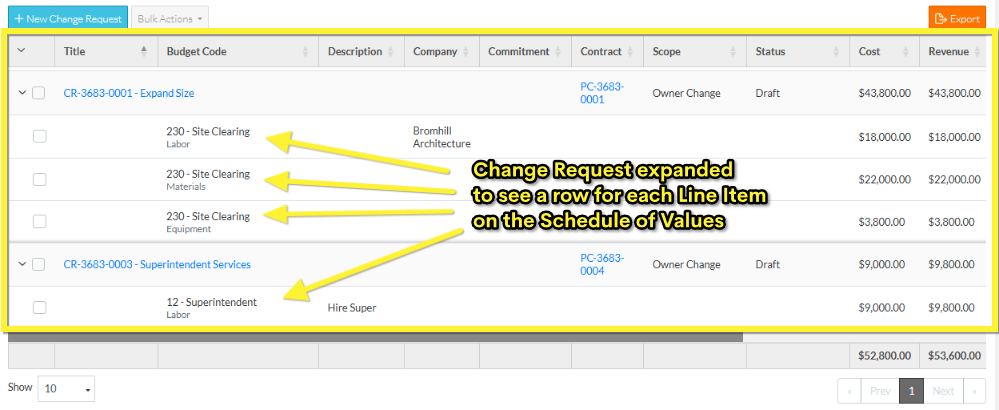 - Grouped List View - displays one row for the change request then multiple rows below that for each Line Item on the Change Request Schedule of Values. In this view, the columns displayed can not be changed. The rows can be searched.