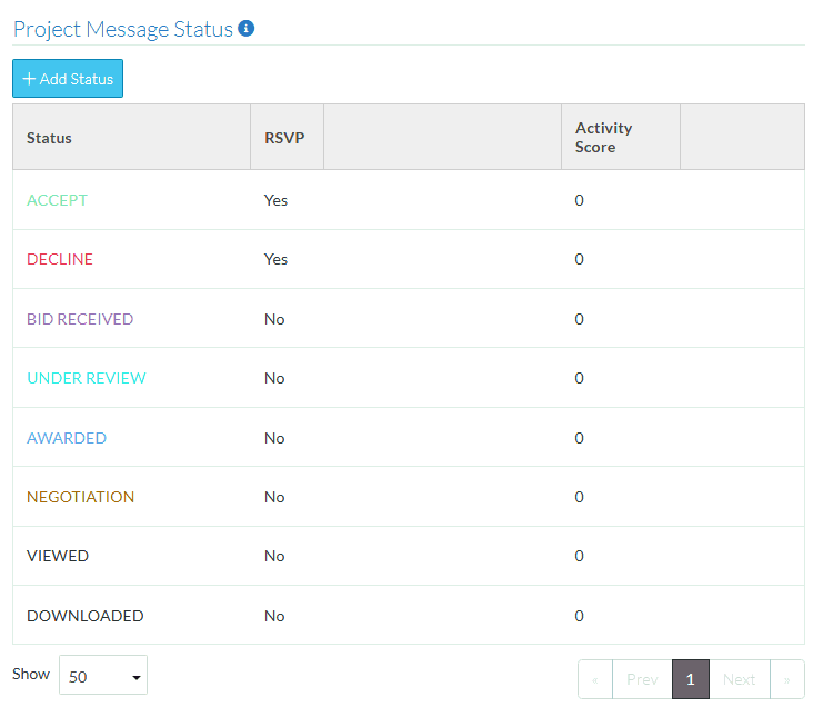 The Project Message Status is where the different statuses that can be assigned to the Bidding process are maintained so they can be used to manage the Bidding process (see Bidding - Managing). There are different types of status: