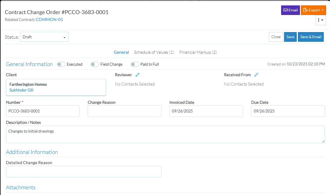 However, the other Line Item information can be still edited after the Contract Change Order is saved such as the Description, Amount or Tax (but only as long as the Contract Change Order is in a Status that enables editing).