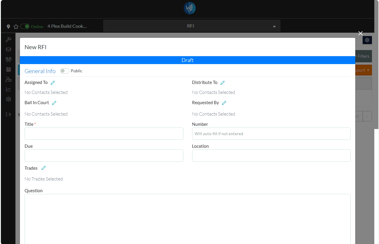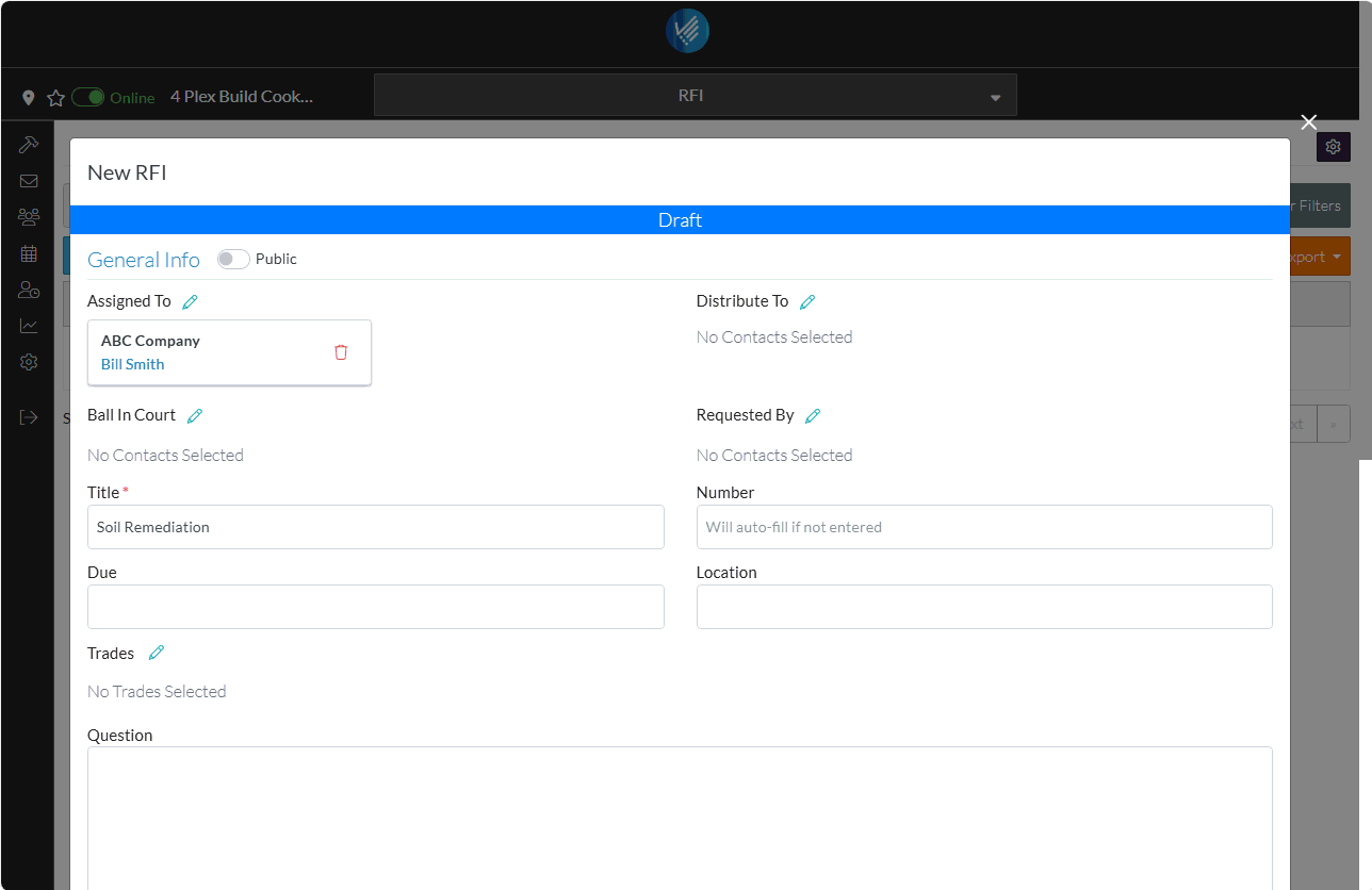 There is other information that can be entered for the RFI Item, such as putting the ball for the RFI in someone's court, entering a due date, entering a location specific to the Action Item, assigning a Trade, setting up accepted responses, adding responses.