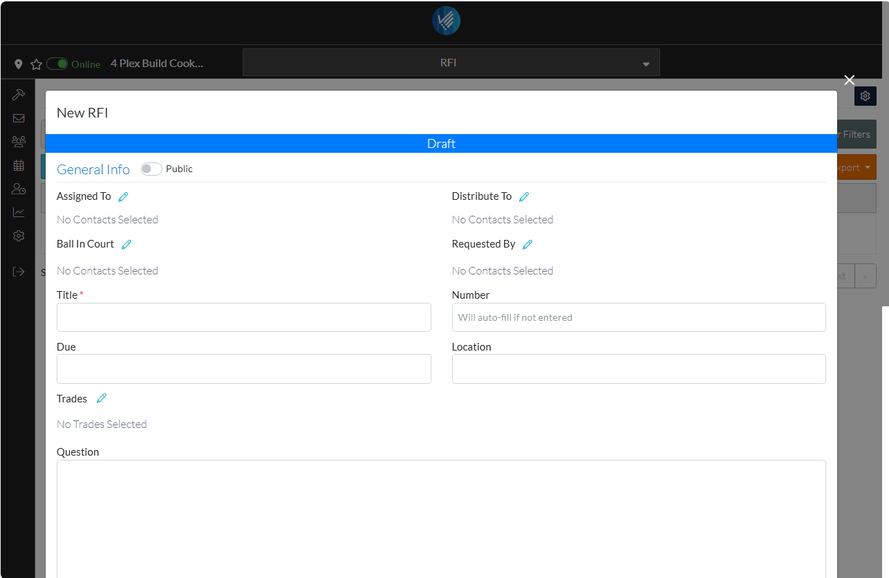 button to save the RFI Item and open it up for responses (Note* alternatively it could be saved but as a draft, while it is still being worked on).