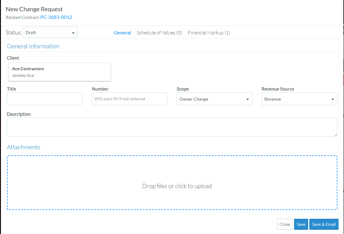 This saves the Change Request including any information on the General, Schedule of Values and Financial Markups Components.