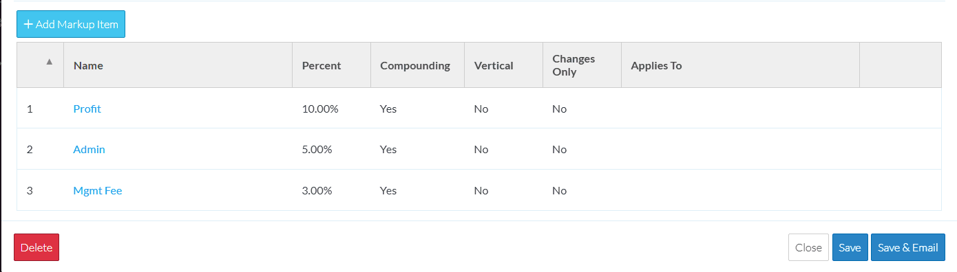 - If they are set to display as a column on the line item and there is more than one Financial Markup, then the columns display in the order set here
