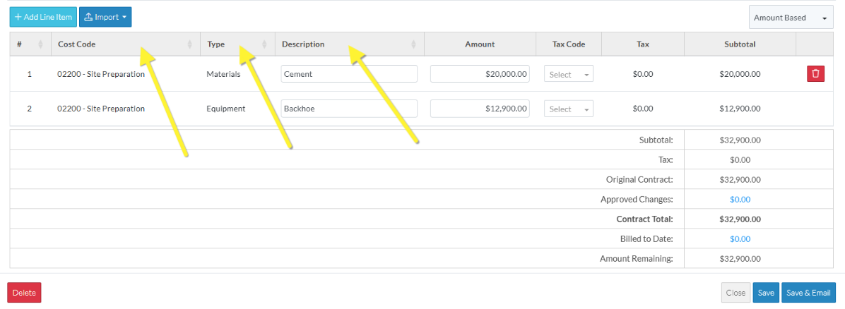 How the Amounts are entered for Line Items depends on the Accounting Method set. See Schedule of Values - Accounting Method for more details.