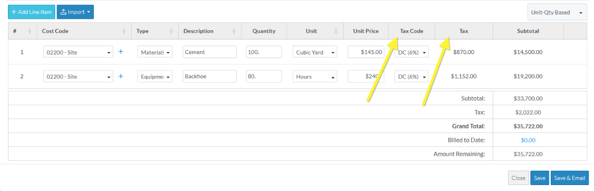 If Tax Codes have been setup, there will be a Tax Code drop down to choose the Tax Code to apply. Then there is also a Tax column that automatically displays the Tax amounts.