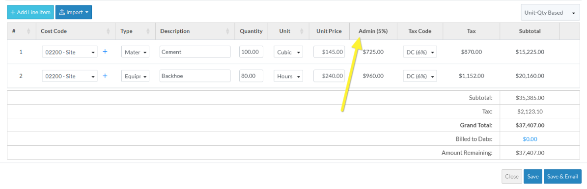If Financial Markups have been setup and configured to appear on each Line Item, there will be a column with the Financial Markup name and Markup Percentage and in the line item field, there will be the automatically calculated Markup amount.