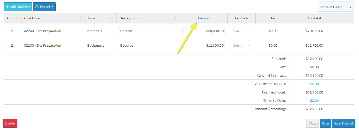 If the Accounting Method is set to Amount Based, the line items will have an Amount column. Enter the Amount of that line item (excluding taxes or Financial Markups).