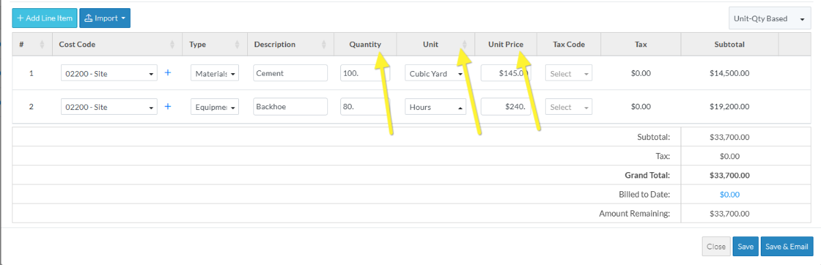 The Subtotal of that Line Item is automatically calculated by multiplying the Quantity x Unit x the Unit Price (then adding any financial markups applicable).