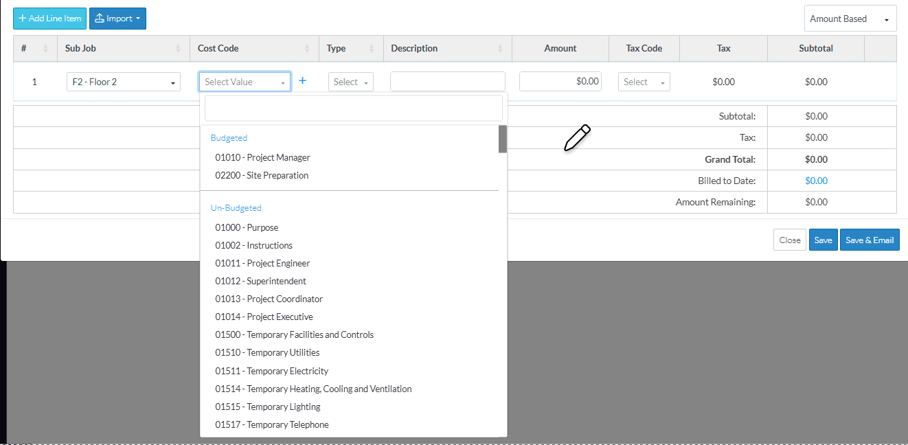 - The list of Cost Codes are separated by Budgeted and Un-Budgeted.