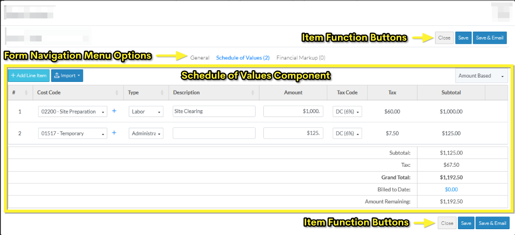 While Line Items are being added, edited or deleted and before the entire item is saved, this is considered a working session. The Save or Save & Email Item Function Buttons must be used to save the entire item and includes saving the Schedule of Values. The Save or Save & Email Item Function Buttons apply to the entire item, not just the Schedule of Values Component; they can be invoked from any component and will save all information on all Components.
